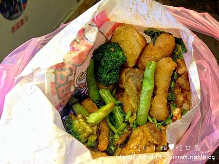 裡面有炸杏鮑菇、花椰菜、四季豆還有魷魚