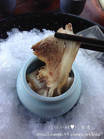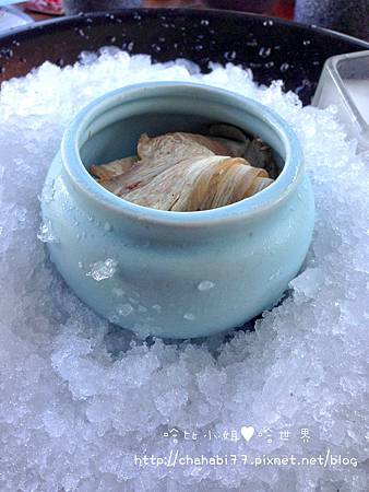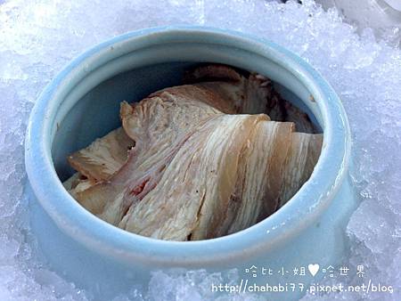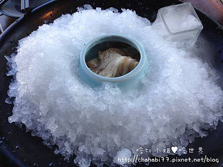 將無老肉放置在一個小盅裡,旁邊撲著滿滿的碎冰塊